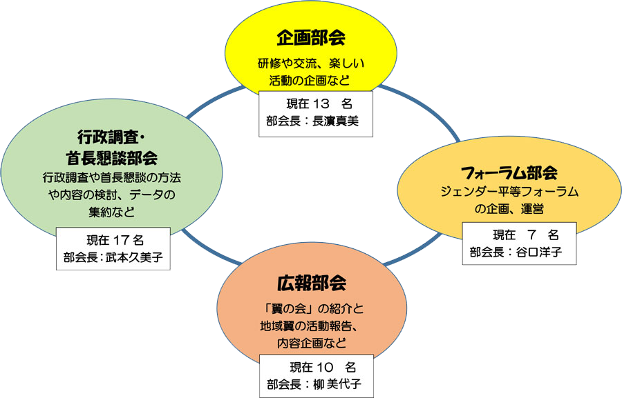翼の会では、活動の活性化・エンパワーメントと交流・活動の検討と実施、集約を目的とした、各部会を設定しています。それぞれに適材適所で受け持ちながら翼の会の地域活動の支援と情報発信を行っています。